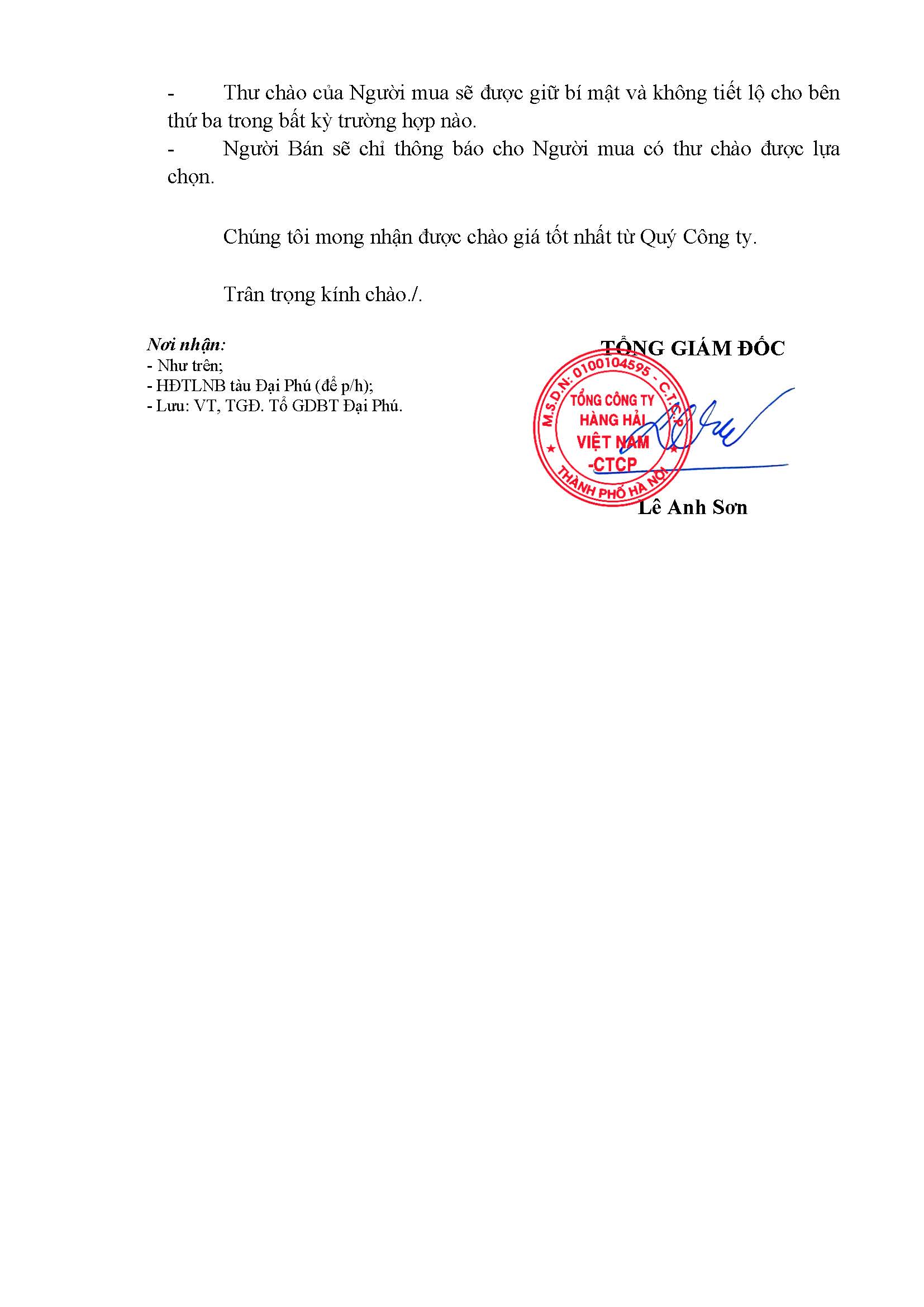 Thư chào bán tàu Đại Phú