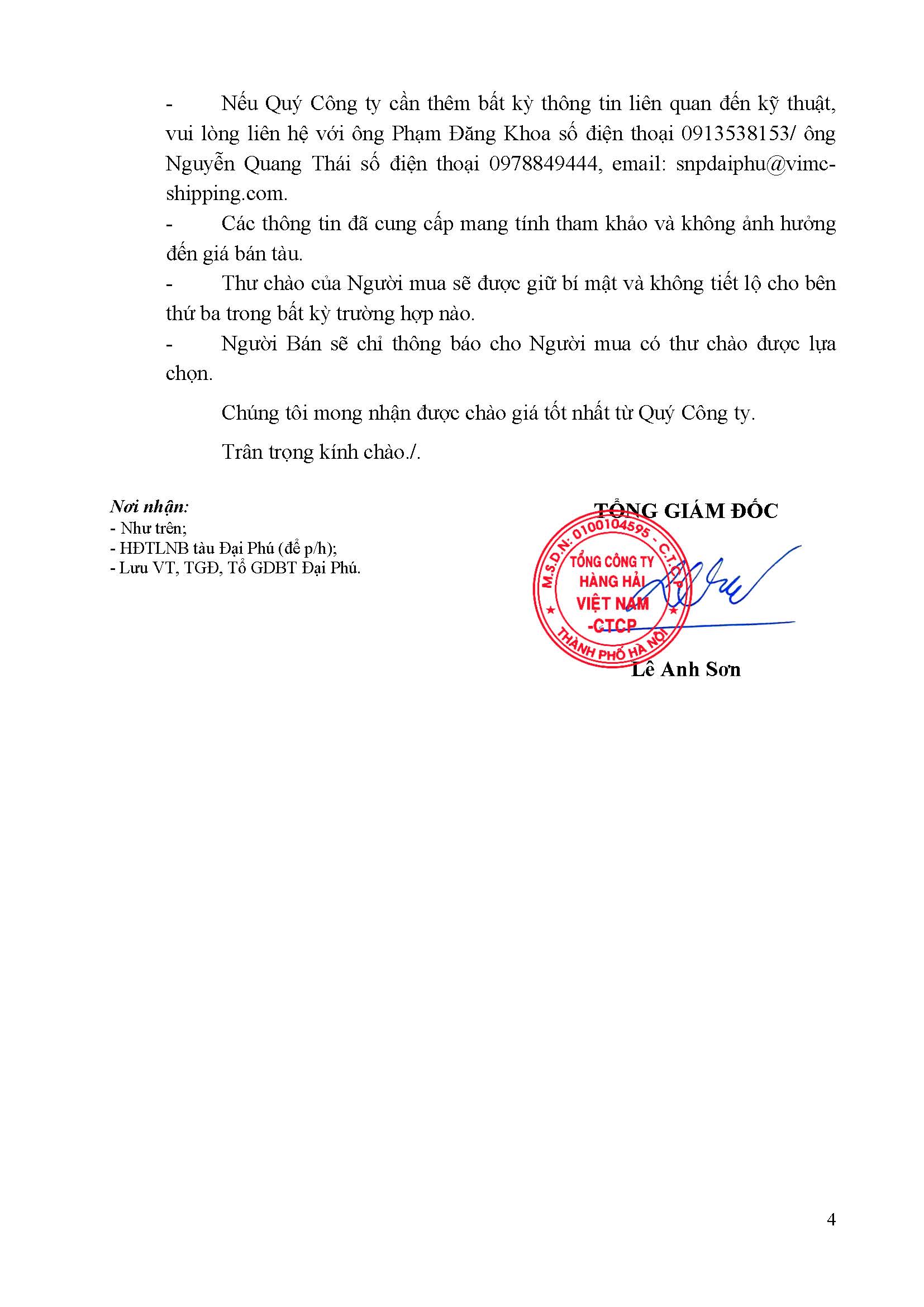 Thư chào bán tàu Đại Phú